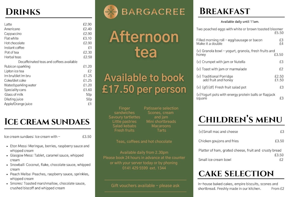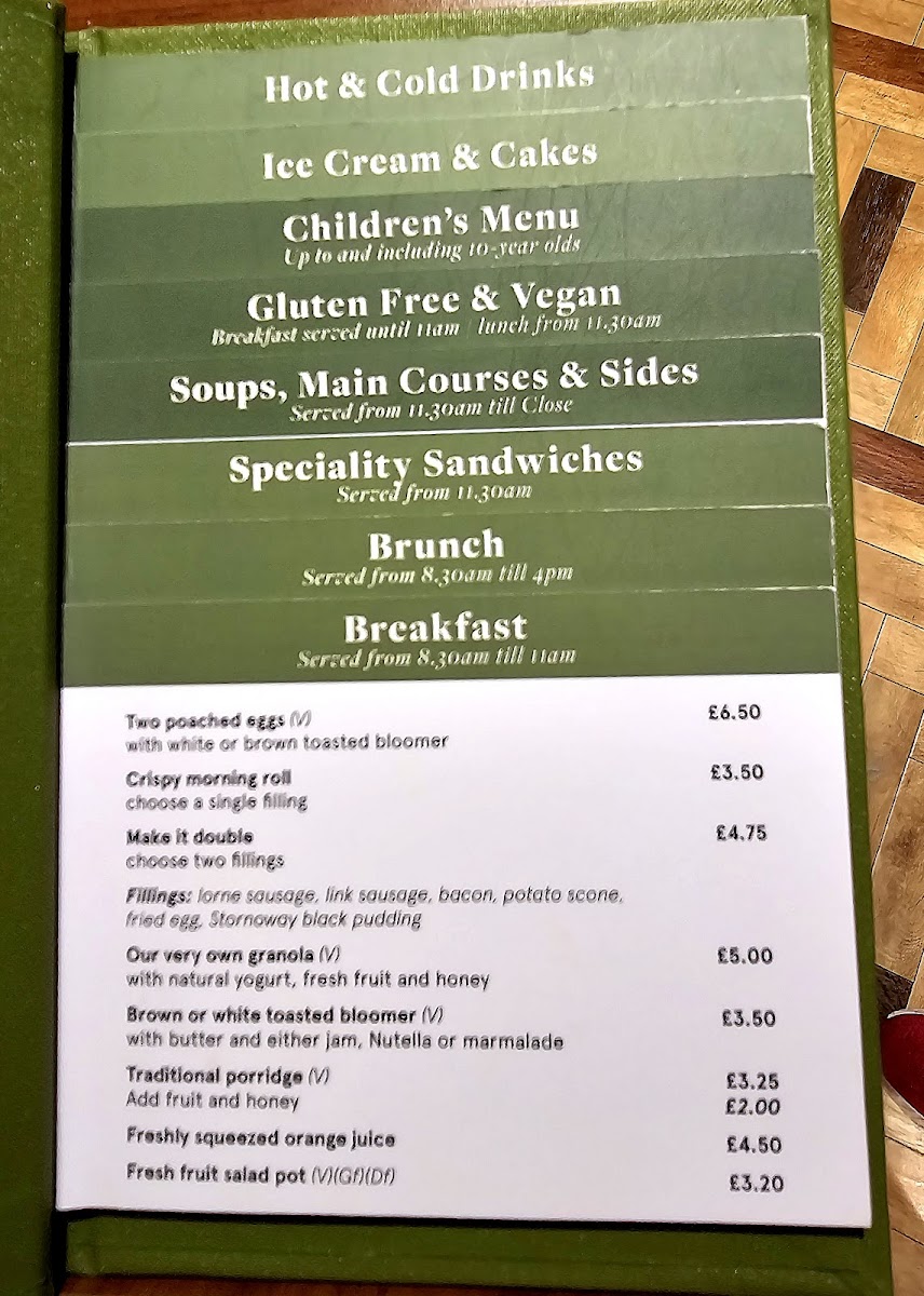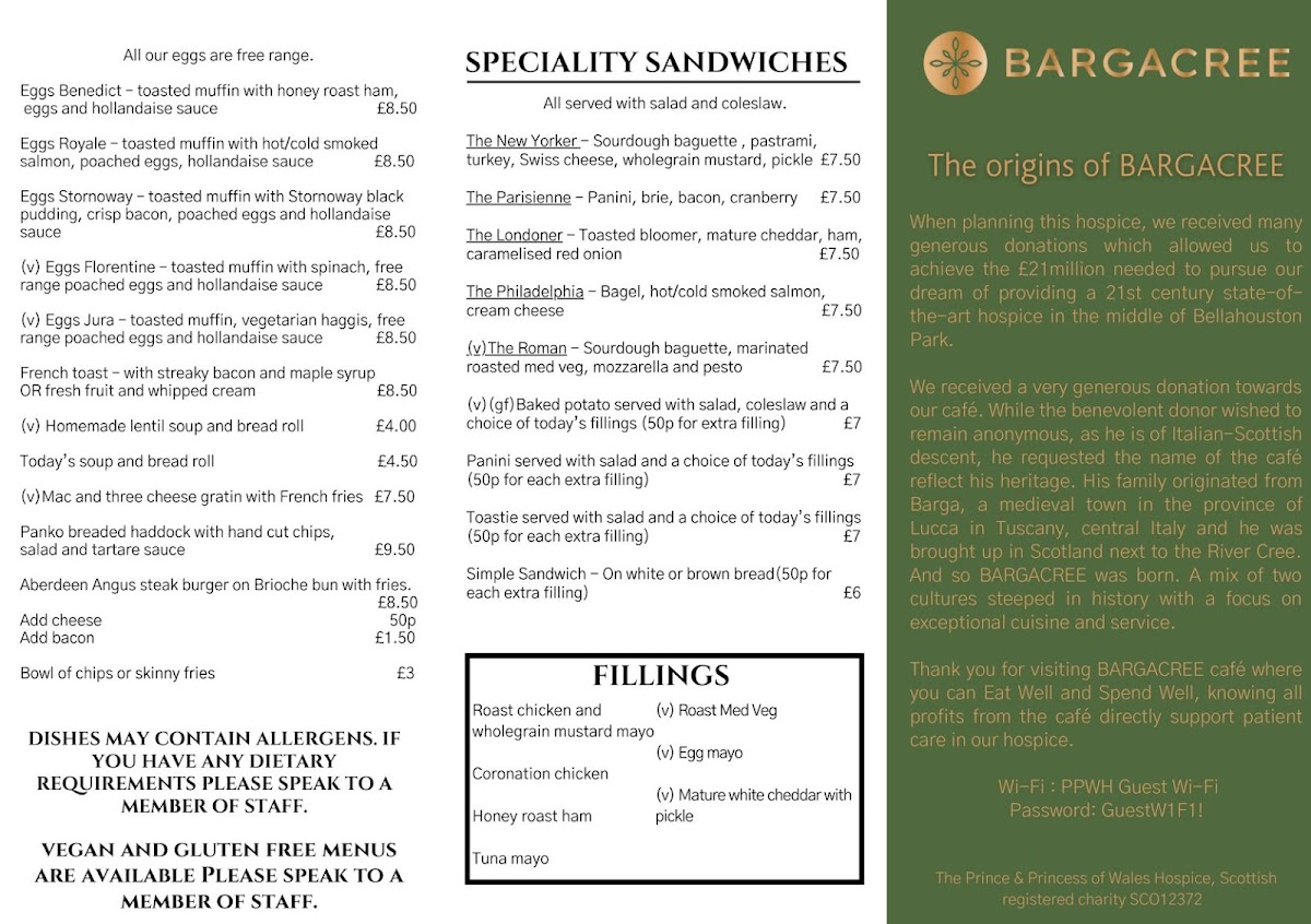 The menu at The Prince & Princess of Wales Hospice offers a variety of options suitable for different times of the day, including breakfast, light meals, and snacks. It features a selection of hot and cold beverages, including a range of teas.